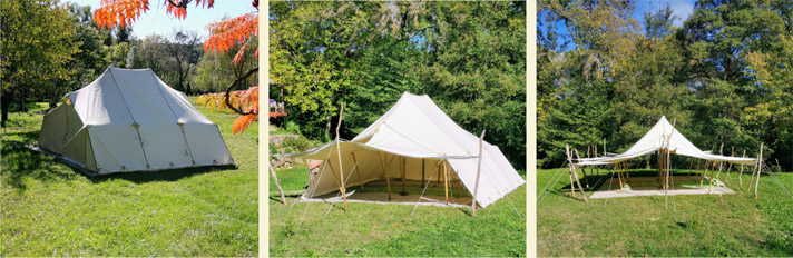 ou en rallongeant les mâts. Les cotés de la tente peuvent être fixés au sol, enroulés ou relevés